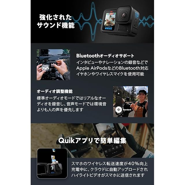 【HyperSmooth 6.0 ブレ補正】HyperSmooth 6.0でカメラ内ビデオ補正機能がさらにレベルアップ。どんなに揺れが激しくても、驚くほど安定した映像を撮影できます。HyperSmooth AutoBoostを使えば、スピードや動きに応じてショットをシームレスに調整できるので、常に最も幅広い画角で滑らかな映像を記録できます。【優れた耐久性と水深10mまでの防水性能】HERO13 Blackは高い耐衝撃性を備えているため、沼地、雪、水中 (水深10mまで) など、あらゆる場所で冒険を楽しめます。撥水レンズカバーがレンズフレアなどの現象も抑えるため、鮮明な画質のまま写真やビデオを撮影し続けることができます。
