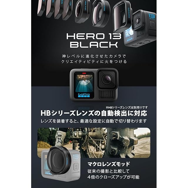 【自動検出対応 HBシリーズレンズ】HERO13 BlackはHBシリーズレンズ(別売)に対応。目的の撮影シーンに応じてカメラを即座にセットアップできます。超広角レンズモッドは、アクション満載のシーンや壮大な風景の撮影で本領を発揮する究極のPOVレンズです。マクロレンズモッドを使うと、細部まで鮮明に映し出すクローズアップショットを撮影できます。NDフィルターを使えば映像にモーションブラーを追加し、明るさを調整してプロレベルに仕上げることができます。プロレベルのシネマティックなショットをお望みなら、アナモフィックレンズモッドをお試しください。レンズやフィルターを取り付けると、HERO13 Blackが自動で検出し設定を調整します。 【バーストスローモーション】HERO13 Blackには、歴代最高レベルのスローモーション機能が搭載されており、通常再生と比べて13倍もスローなスローモーションでビデオクリップを撮影できます。最大5.3Kの解像度で4倍スローモーションの短いクリップを撮影すれば、肉眼では追えないディテールを捉えることもできます。【クラス最高レベルの5.3Kビデオ】5.3Kビデオの息をのむような美しい画質。解像度が4K比で91%、1080p比で665%も向上しています。HERO13 Blackはアクションを細部まで高画質で捉えるため、どのレンズでも目を見張るような映像に仕上がります。さらにGoPro Quikアプリを利用すれば、5.3Kビデオからお気に入りの瞬間を最大24.7MPの写真として切り出すこともできます。 【HyperSmooth 6.0 ブレ補正】HyperSmooth 6.0でカメラ内ビデオ補正機能がさらにレベルアップ。どんなに揺れが激しくても、驚くほど安定した映像を撮影できます。HyperSmooth AutoBoostを使えば、スピードや動きに応じてショットをシームレスに調整できるので、常に最も幅広い画角で滑らかな映像を記録できます。【優れた耐久性と水深10mまでの防水性能】HERO13 Blackは高い耐衝撃性を備えているため、沼地、雪、水中 (水深10mまで) など、あらゆる場所で冒険を楽しめます。撥水レンズカバーがレンズフレアなどの現象も抑えるため、鮮明な画質のまま写真やビデオを撮影し続けることができます。 【環境を問わず長時間撮影】撮影は長く、充電は短く。1900mAhの大容量Enduroバッテリーが、酷暑から極寒まで、あらゆる環境での長時間撮影を可能にします。4K30または5.3K30なら1.5時間、1080p30なら2.5時間以上連続撮影できます。(気温25°C、風速0.6m/秒で測定した撮影時間。広角デジタルレンズを装着、ワイヤレス接続、Bluetooth、HyperSmoothオン、前方と後方のLCDスクリーンオン (1分のスクリーンセーバー)、ボイスコントロールとGPSはオフ。)【360度水平ロック 内蔵】HERO13 Blackのリニア + 水平ロックデジタルレンズにより、たとえ撮影中にカメラが360度回転しても、水平を維持した状態でスムーズかつ安定した映像を撮影できます。HyperSmoothビデオブレ補正と水平ロックを組み合わせれば、プロレベルの滑らかな映像が実現します。 【充実の電源オプション】HERO13 Blackは、歴代のGoProにはない電源オプションに対応。Contacto防水マグネット式電源ケーブル + ドアキット(別売)では、マグネット式リンクを使って外部電源にすばやく簡単に接続できます。また、デュアルバッテリーチャージャー + 内蔵パワーバンク(別売)は、付属のEnduroバッテリー2個をどこでも簡単に充電できます。撮影時間を延ばすため、直接カメラに接続することもできます。【マウントの柔軟性が向上】HERO13 Blackは3つのマウントオプションに対応。かつてないほど多様なシーンで活躍します。新しいマグネット式ラッチマウント(別売)を使えば、さまざまなマウントでカメラをスピーディに着脱可能。激しく揺れる場面では、内蔵のマウントフィンガーが活躍。GoProマウントにしっかりと固定できます。内蔵のマウント用1/4-20ネジは、三脚などの一般的なカメラ用アクセサリーに使用できます。 【HLG-HDRビデオ】HERO13 Black では、クラス最高レベルの画質がさらに進化。プロが10-bitのRec. 2100カラースペースで5.3K/4Kビデオを撮影するときに使用する標準のHDRフォーマット、ハイブリッドログガンマ (HLG) での撮影が可能です。HLG HDRの再生には、対応するディスプレイとメディアプレーヤーが必要です。HLGなしのHDRは、一般的なディスプレイとメディアプレーヤーで視聴できます。【10-bitカラー + Logエンコーディング】HERO13 Blackでは、10-bitの標準ビデオまたはGP-Log (10-bitのLogエンコーディング) のいずれかを選択して撮影できます。10億色超の表示に対応する10-bitカラーは、高い色深度と滑らかなグラデーションが特徴で、よりリアルな映像を捉えます。上級ユーザー向けのGP-Logでは、ポストプロダクションの自由度が上がるため、映像の細部をより際立たせることができます (ルックアップテーブル/LUTが提供されます)。" 【ワイドスクリーン、縦方向、フルスクリーンの撮影】HERO13 Blackのパワフルな1/1.9インチイメージセンサーが、可能性をさらに広げます。テレビでのフルス