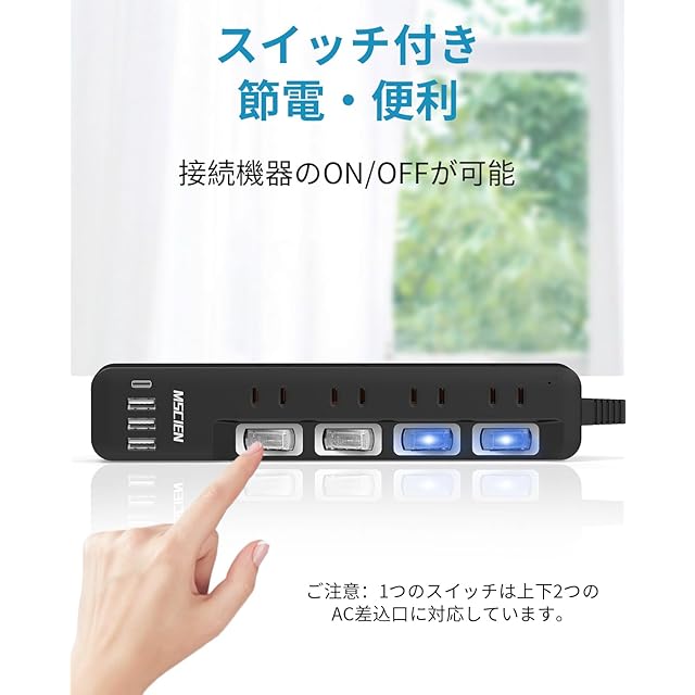 【スイッチ付き・節電・省エネ】コンセントには接続機器のON/OFFができるスイッチが付いており、使わないところは切って電力を節約することができます。スイッチLEDランプが付いており、一目で通電が見えて安心です。(※ご注意:各スイッチは上下2つのAC差込口を制御します。)
