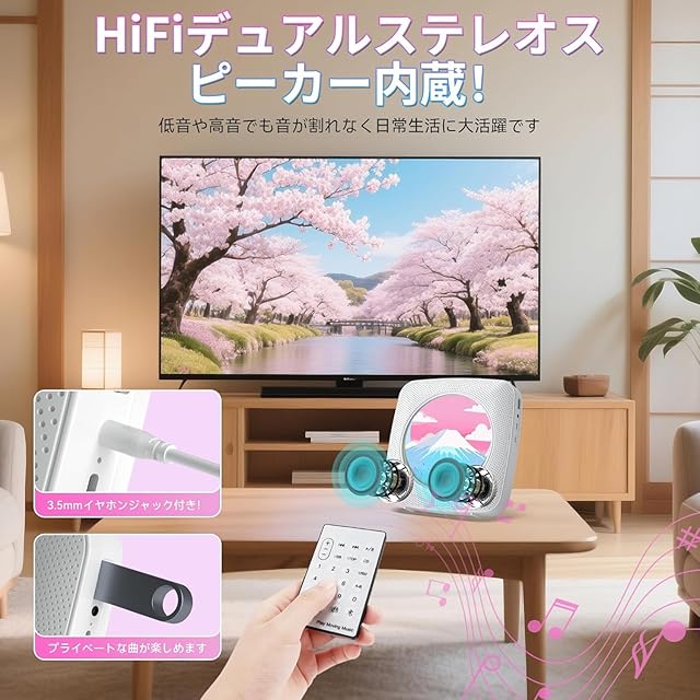【高音質スピーカー内蔵&リモコン付き】Y01 CDプレイヤーは、Hi-Fiスピーカーを内蔵しており、日常生活の中で低音域や高音域がひびくことなく、音楽そのものを楽しめます。 また、3.5mmヘッドフォン(別売)でプライベートな音楽を楽しめます。更に、付属のリモコンで座ったままで操作できるので、歩き回ることなくいつでも楽しむことができます。ご注意:CD/USBモードで3.5mmイヤホンを差し込むとCDプレーヤーのスピーカー が自動的に停止されます。