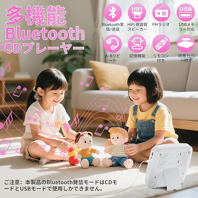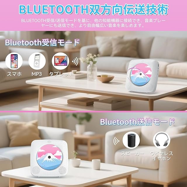 【多機能 Bluetooth CDプレーヤー】Y01 CDプレーヤーは、Bluetoothデュアルモード(受信/送信モード)を搭載しており、スマホ、MP3などの音楽を再生できだけでなく、ワイヤレスイヤホン、スピーカーなども接続でき、深夜の音楽鑑賞でも家族に迷惑をかけず、より自由に幅広い音楽を楽しめます。CD再生のほかに、FMラジオ機能(周波数:76~108MHz)にも対応しており、緊急時のラジオとしても実用的です。 また、本体またはリモコンの「MODE」でBluetoothモード/CDモード/FMモード/USBモードの4つのモードを簡単に選択できます。ご注意:本製品のBluetooth送信モードはCDモードとUSBモードで使用しかできません。