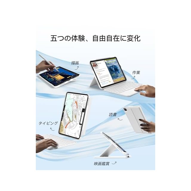 磁気取り外しデザイン:キーボードとiPad保護ケースは磁石で接続されており、わずか1秒で簡単に取り外し可能です。背面パネルは横向きと縦向きの両方をサポートし、仕事、学習、映画鑑賞、絵を描く、読書など、多角的なニーズに対応します
