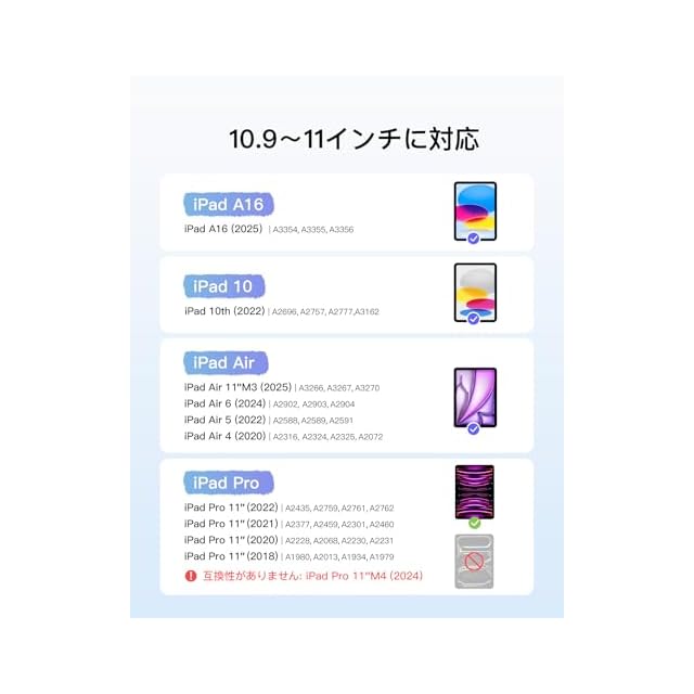 互換性:iPad A16 第11世代/第10世代、iPad Air 11インチ M3 2025/M2 2024、iPad Pro 11インチ第4/3/2/1世代、iPad Air 第5世代/第4世代(10.9インチ)向けに特別に設計されています。iPad Pro 11 第4世代 2022(A2435/A2759/A2761/A2762)、iPad Pro 11 第3世代 2021(A2301/A2377/A2459/A2460)、iPad Pro 11 第2世代 2020(A2228/A2068/A2230/A2231)、iPad Pro 11 第1世代 2018(A1980/A2013/A1934/A1979)と互換性があります