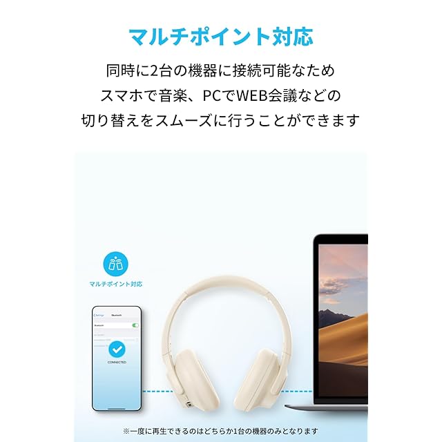 マルチポイント対応: 同時に2台の機器に接続可能なため、スマホで音楽、PCでWEB会議などの切り替えをスムーズに行うことができます。 ※一度に再生できるのはどちらか1台の機器のみとなります。