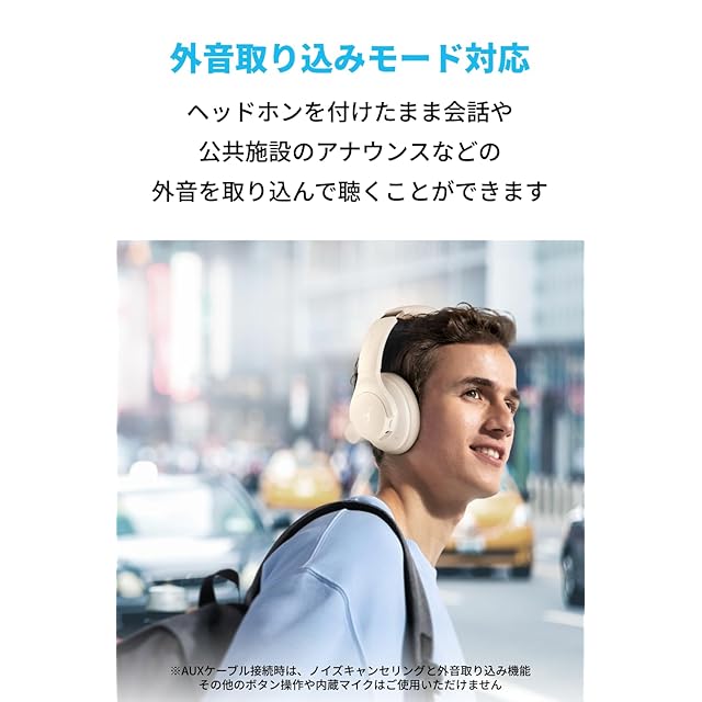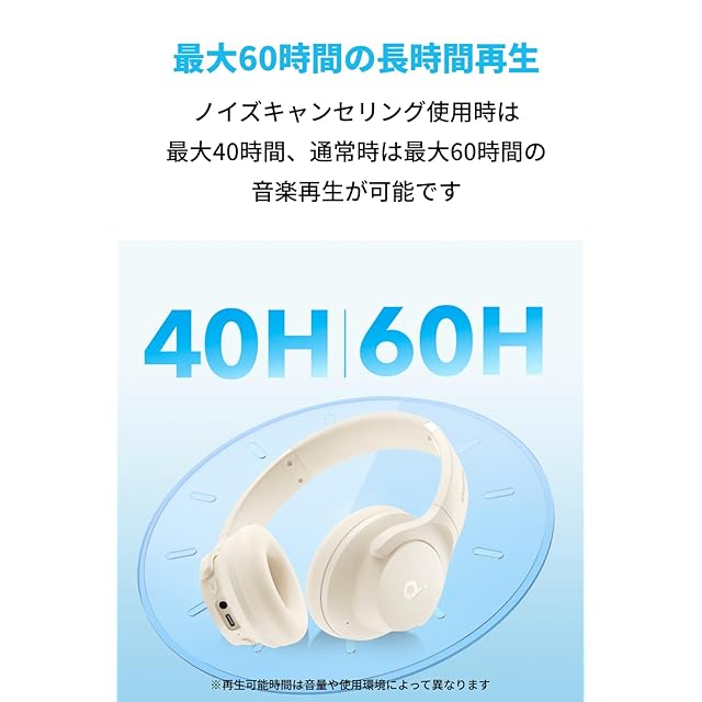 アクティブノイズキャンセリング(ANC):ヘッドホンに搭載された4つのマイクが周囲の騒音を検知。アクティブノイズキャンセリングによって自動車や飛行機のエンジン音などの低周波ノイズを除去します。 最大60時間の長時間再生:ノイズキャンセリング使用時は最大40時間、通常時は最大60時間の音楽再生が可能。5分間の充電で約4時間の音楽再生も可能です。※再生可能時間は音量や使用環境によって異なります。
