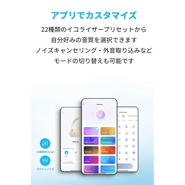 アプリでカスタマイズ:Soundcoreアプリ上で、 22種類のイコライザープリセットから自分好みの音質を選択できます。ノイズキャンセリング、標準、外音取り込みなどのモードの切り替えも可能です。