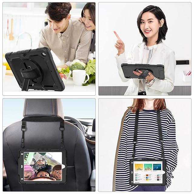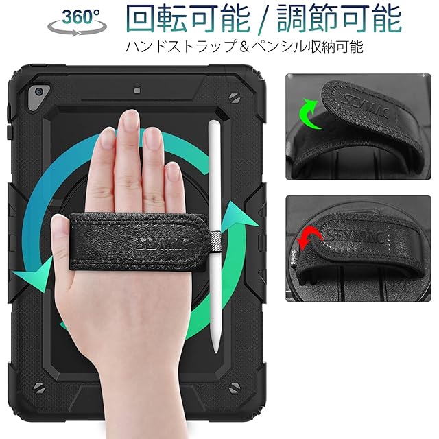 SEYMAC stock iPad 6世代/5世代/Pro 9.7/Air2 9.7インチケース 耐衝撃 保護フィルム付き ペン収納 360°回転スタンド ハンドストラップ ショルダーストラップ 全面保護カバー(ブラック) | TREND DESIGN 家電専門店