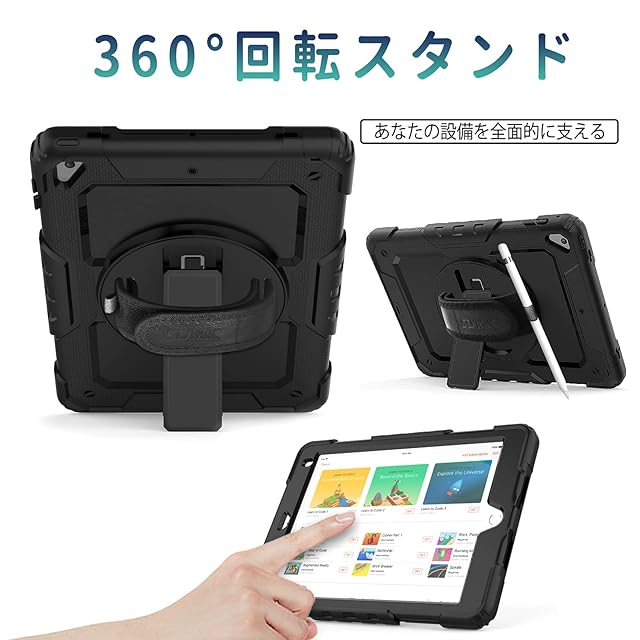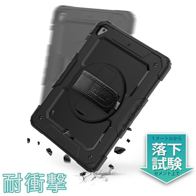 SEYMAC stock iPad 第6世代 5世代 ケース 耐衝撃 頑丈 落下保護 360°回転スタンド 調節可能 頑丈 丈夫 ハンドストラップ ペン収納 ショルダーストラップ ハード 全面 フィルム 衝撃保護 現場 工事現場用 子供 キッズ 蓋なし 横置き 縦置き 9.7