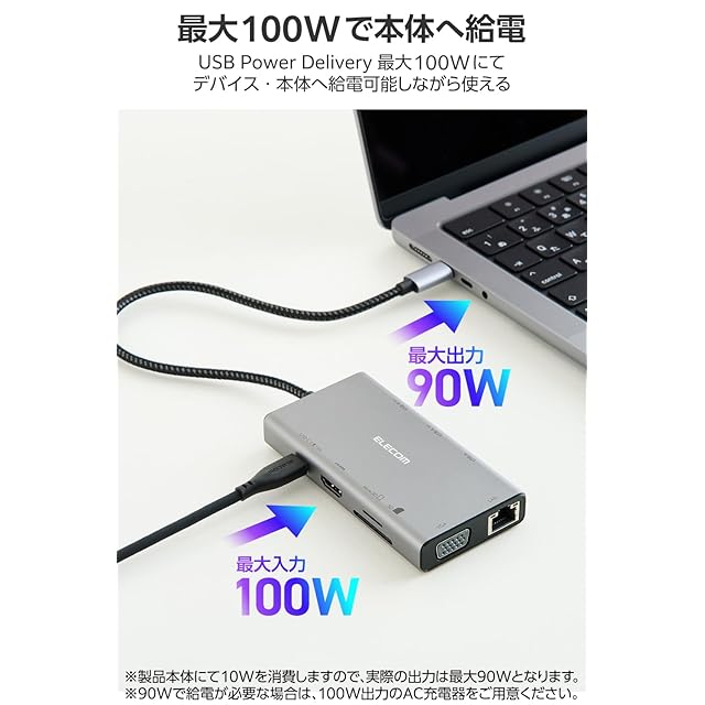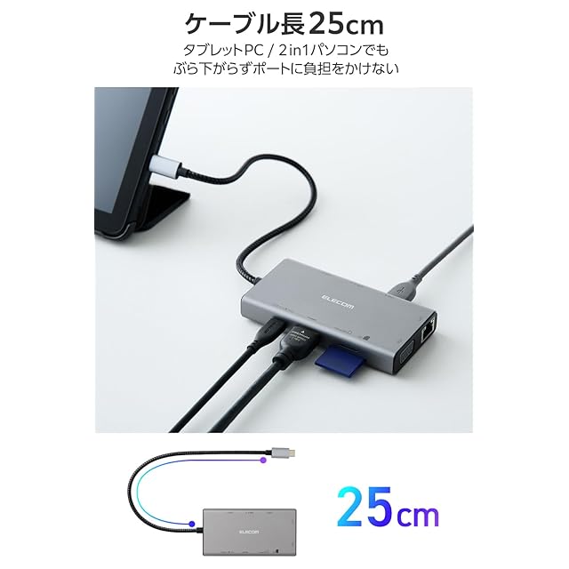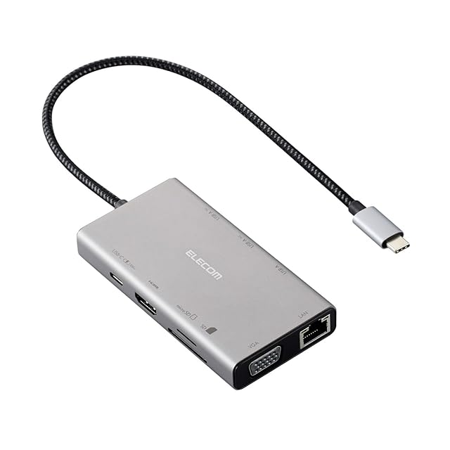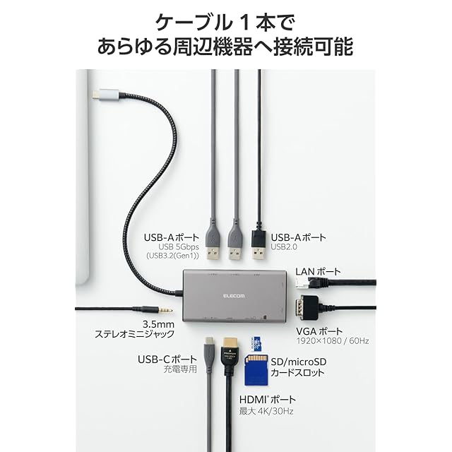 <b>【 仕様 】</b><br>■対応OS(Windows):Windows 11/10<br>■対応OS(mac):macOS Sonoma 14/macOS Ventura 13/macOS Monterey 12<br>■対応OS(iPadOS):iPadOS 17/16<br>■対応OS 備考:※各OSの最新バージョンへのアップデートや、サービスパックのインストールが必要になる場合があります。<br>■コネクタ仕様(アップストリーム):USB Type-C(TM)プラグ<USB 10Gbps(USB3.2(Gen2))>、USB Power Delivery対応(最大入力100W/最大出力90W)、DisplayPort(TM) Alt mode(USB2.0接続時はUSB2.0互換で動作(USB2.0接続時は映像出力非対応))<br>■USBポート(ダウンストリーム):1:USB Type-Cポート×1 ※充電専用USB Power Deliveryポート<br>■USBポート(ダウンストリーム):2:USB-Aポート<USB 5Gbps(USB3.2(Gen1))>×2 ※映像出力非対応<br>■USBポート(ダウンストリーム):3:USB-Aポート<USB 480Mbps(USB2.0)>×1<br>■映像出力ポート(ダウンストリーム):1:HDMI×1<対応解像度:最大4K/30Hz> ※入力信号は標準のDisplayPort1.2に対応している必要があります。<br>■映像出力ポート(ダウンストリーム):2:VGA×1<対応解像度:最大1920×1080/60Hz> ※HDMIポートとVGAポート、同時接続の場合、両ポートの最大解像度は1920×1080/60Hzとなります。<br>■LANポート(ダウンストリーム):RJ-45(1000BASE-T/100BASE-TX/10BASE-T)<br>■カードリーダー(ダウンストリーム):1:SDカードスロット×1 ※SD/SDHC/SDXC<br>■カードリーダー(ダウンストリーム):2:microSDカードスロット×1 ※microSD/microSDHC/microSDXC<br>■音声ポート(ダウンストリーム):φ3.5mm4極ステレオミニジャック<br>■ケーブル長:約25cm ※プラグ含まず<br>■カラー:グレー<br>■外形寸法:幅約105mm×奥行約54mm×高さ約16mm ※ケーブル含まず<br>■動作環境:温度5℃~40℃、湿度25%~75% ※結露なきこと<br>■期間:1年間<br><br><b>