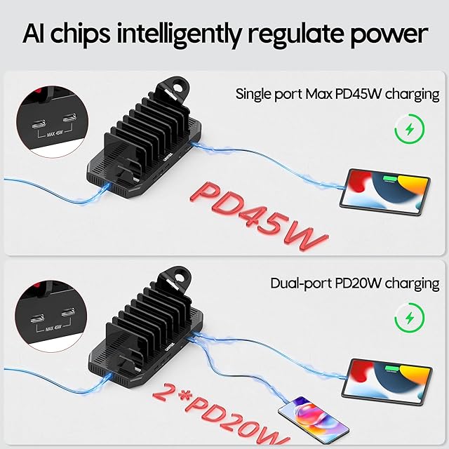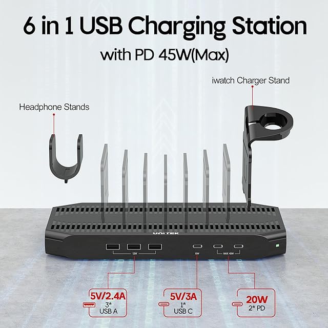Unitek 2025 USB PD充電ステーション 6ポート PD20W*2+USB-C*1 卓上充電スタンド 60W PSE認証済 6台同時 1.5A/2.4A/3A スマートIC搭載 複数台対応 Android/iPhone/iPad/airpods/kindle/タブレット/PSP/ラップトップ 仕切り板 間隔調整可能 アップルウォッチ収納スタンド 収納便利 卓上