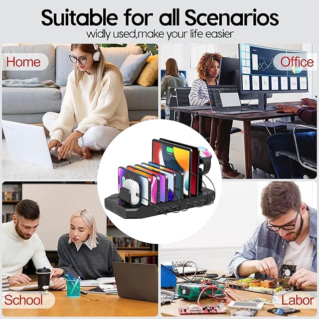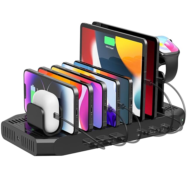 【6台同時充電タイプ】付属の仕切り板(高い板11枚+アップルウォッチ収納スタンド1枚+airpods収納スタンド1枚)で最大13台のモバイル機器をキレイに置けます。スマートIC内蔵で充電中、USBデバイス端末に適した最適な電圧を自動的に調整できます。スマホとiPadなら最大で6台まで充電できます。