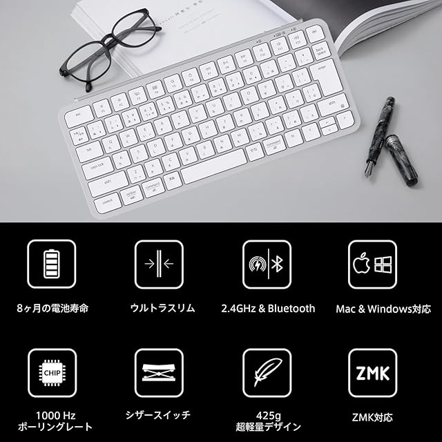 Keychron B1 Proは、シザースイッチを採用し、軽量、超薄型のワイヤレスキーボードで、1,200時間の長時間駆動を実現。2.4GHzワイヤレス、Bluetooth、有線モードに対応し、スマートフォン、タブレット、PC、Macに簡単に接続できます。ZMKのカスタマイズ機能により、自宅、オフィス、旅行など、用途に合わせた設定が可能です。また、シリコンカバーが付属します。