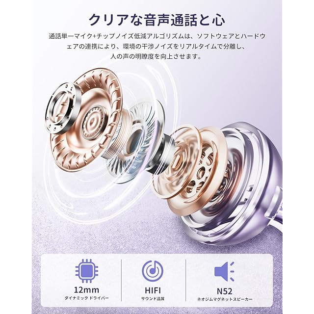 12mmダイナミックドライバーとENCコール:12mmドライバーと高感度デュアルマグネティックダイアフラムにより、深みのある低音からクリアな高音まで幅広いサウンドを提供します。マイクにはENCノイズ低減機能があり、周囲のノイズを低減し、クリアな通話音声を確保できます。臨場感あふれるサウンドと高品質な通話性能は、音楽鑑賞やビジネスシーンに最適です。