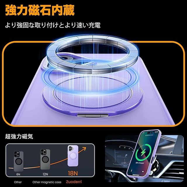 【MagSafe対応】アイフォン16 ケースをつけたままマグセーフ機能を快適に使用できます。背面に薄くて強いマグネット内蔵しています、ワイヤレス充電や車載ホルダーやアクセサリとのあらゆる充電に安定で接着ができ、差し込みのいらないより簡単により素早く充電できます