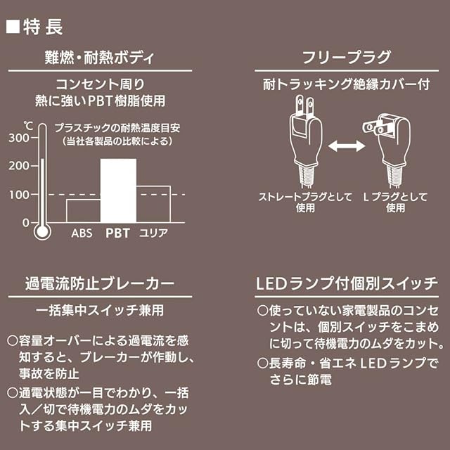 ◆コンセント周りに熱に強いPBT樹脂を使用した難燃・耐熱ボディ ◆ストレートプラグ/Lプラグ両用のフリープラグ、耐トラッキング絶縁カバー付き ◆ホコリの侵入を防ぐホコリシャッターつき・ 両方同時に差し込まれた時だけシャッターが開くいたずら感電防止構造