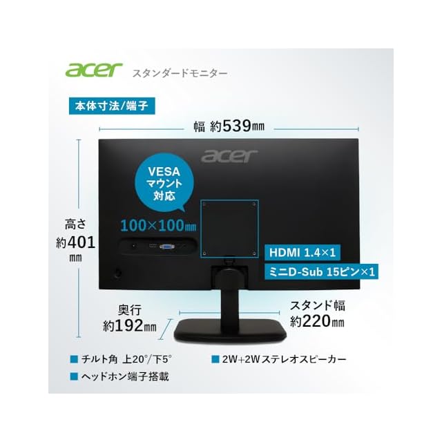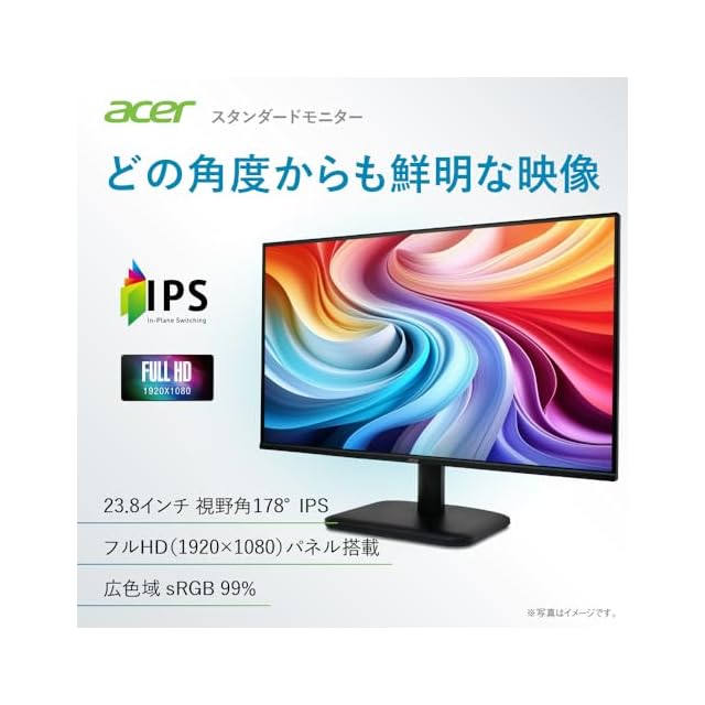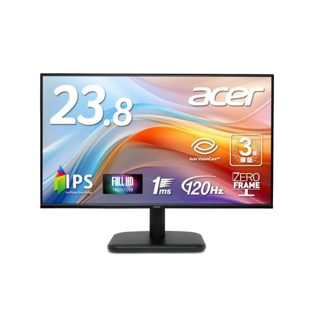 商品名:Acer モニター 23.8インチ フルHD 非光沢 IPS 120Hz 1ms(VRB) sRGB 99% AdaptiveSync HDMI 1.4 ミニD-Sub 15ピン スピーカー・ヘッドフォン端子 音声入力端子 VESAマウント対応 ゼロフレームデザイン 3年(パネルは1年) EK241YGbmix