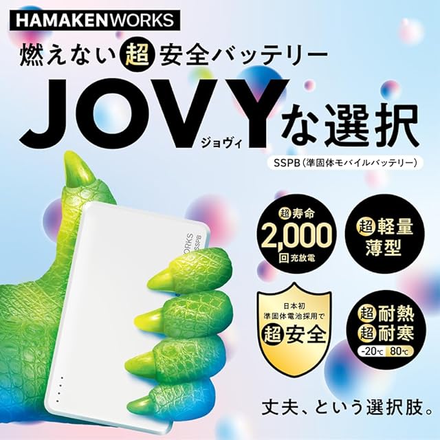 HAMAKEN WORKS 燃えない モバイルバッテリー 10000mAh 世界初 高性能準固体電解質採用 SSPB(Solid State Power Bank) ジョヴィバッテリー USB-C/USB-A 秋葉原発 長寿命 機内持ち込み可能 高い安全性 HW-SSPB100BKN(ブラック) | TREND DESIGN 家電専門店