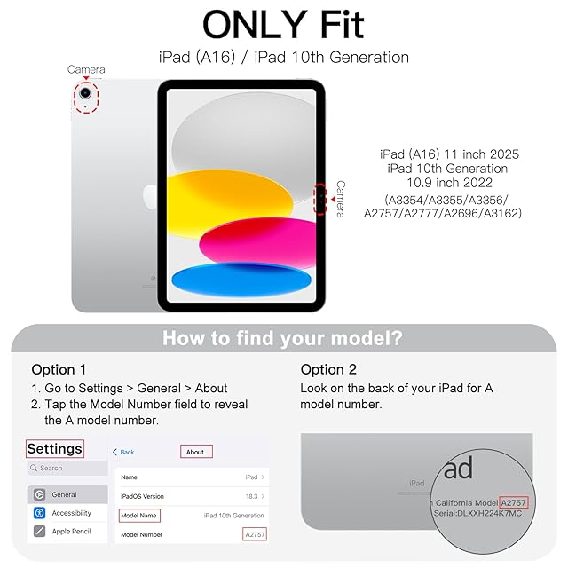 [互換性] iPad(A16)ケース 第11/10世代(2025/2022モデル)用の特別デザインです。対応モデル:A3354 / A3355 / A3356 / A2696 / A2757 / A2777 / A3162。「設定」>「一般」>「情報」の順に選択します、「モデル番号」フィールドをタップしてAモデル番号を表示します