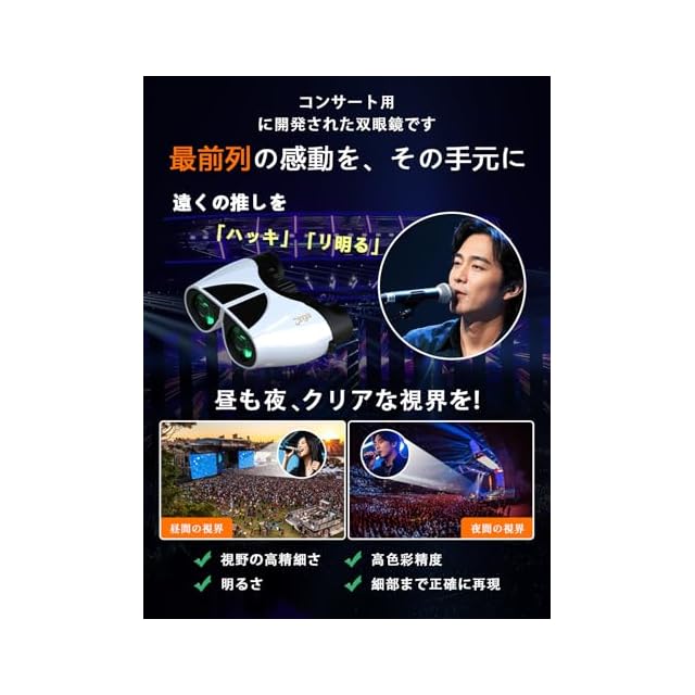 【 高倍率20倍·広視野70度 】双眼鏡 ライブ用は20倍のズームを備えており、ドーム、アリーナ、スタジアムなどの大規模な会場での使用に最適です!高倍率ズームと70度の超広視野により、遠くの座席からでもステージ上の表情を鮮明かつ広範囲に見ることができ、ライブパフォーマンスの臨場感を一層高めます。また、オペラグラスとしても使用可能で、お気に入りのアイドルのイベントにも最適です。