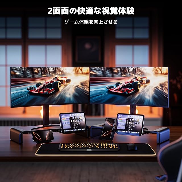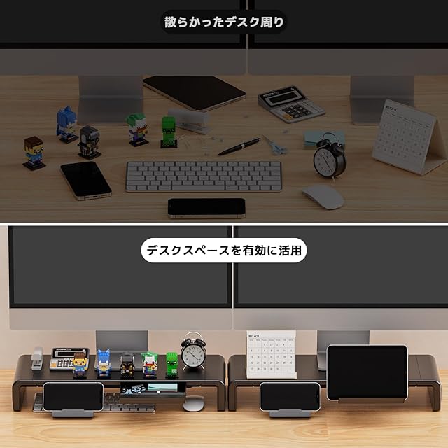 有効なスペースを向上させ:スタンドの下にキーボードやマウス、ゲーム機やノートパソコンなどを収納できるスペースがあります。また、引き出し、スマホやタブレットスタンドも付いているので、デスク周りをキレイに整理し、スペースを有効活用できます。