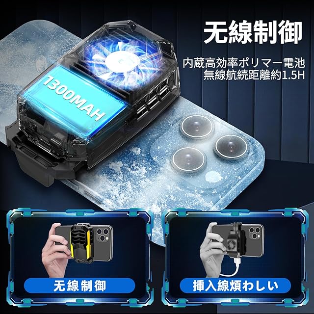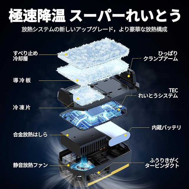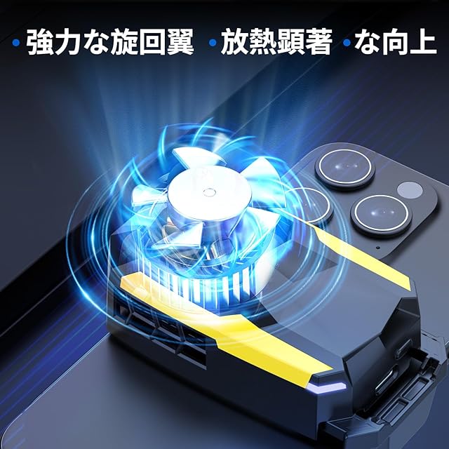 商品名:スマホ 冷却ファン ペルチェ素子 バッテリー内蔵式 急速冷却 伸縮式 スマホクーラー 軽量 スマホ 冷却 スマホ熱対策 静音 揺れない 手が邪魔にならない FGO実況専用 原神 荒野行動 ゲーム/ライブ/動画視聴/写真撮影/テレワーク時に対応 5-7.8インチ等多機種対応 日本語説明書(ブラック&黄)