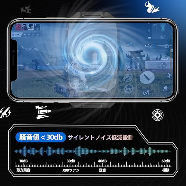 【超静音強力な旋回翼&超静音設計】 スマホクーラーは超静音の強力な渦巻きの大きい扇の葉を採用して、回転速度は9000rpmに達することができて、本体の周囲は3面の風力学のタービンの風の道があって、放熱の速度を速めて、放熱の量を高めて、冷却の効果を最適に達することをさせます。スマホ冷却ファンは騒音がほとんどなく(約30dB)、図書館で使っても身近な人に影響がありません。動作中はファンの上に物を置かないでください。排熱できず、逆に発熱します。ファンが適切に排熱できるほど、冷却効果は高くなります。