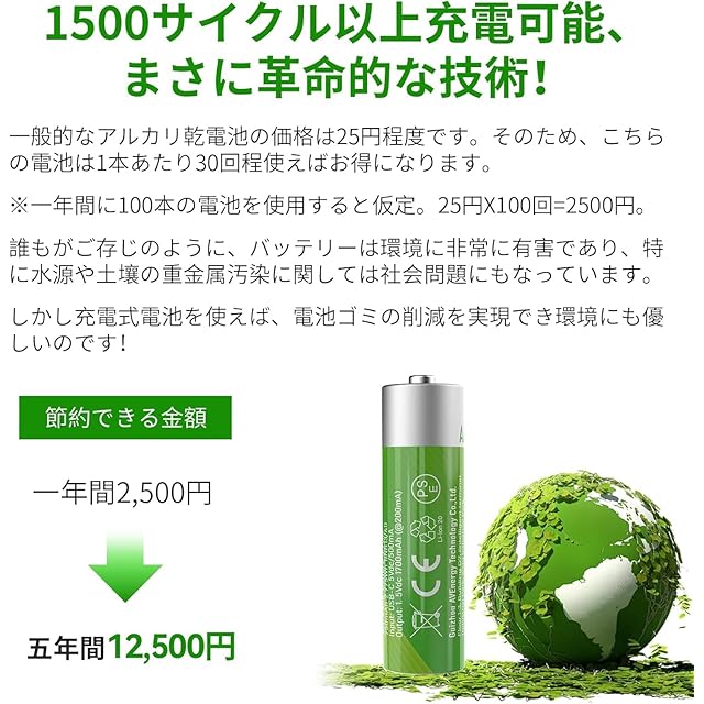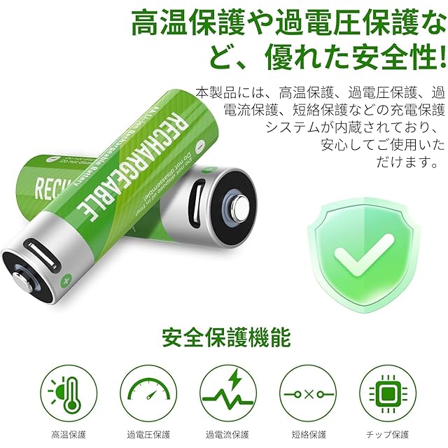 【安全保護】単3形充電池には複数の保護システムが組み込まれており、充電時の過充電や過放電などの安全リスクを回避し、日本の電気製品安全法や技術基準に対応しており、使用者の安全を保障します。充電式電池はHg/Cd/Pbを含みまず、環境に害を与えません。