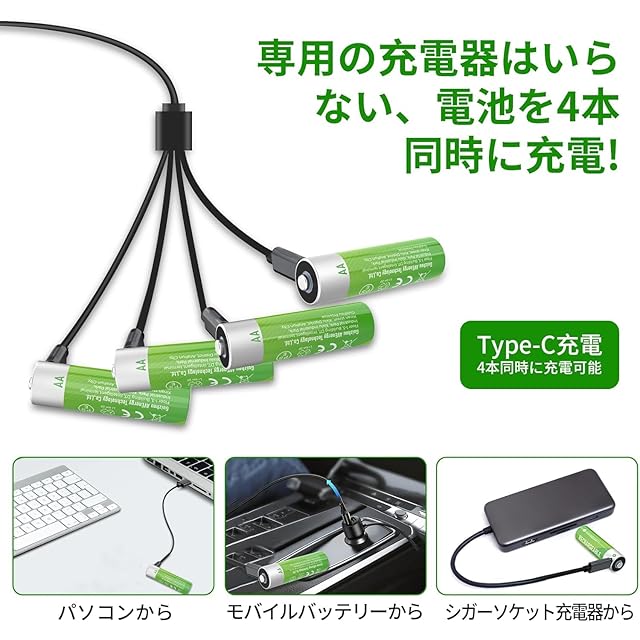 【高速充電】充電式電池は、4口のType-Cから直接充電でき、LED充電表示灯が付いており、4-in-1 USB Type C充電ケーブルを使用して1.5時間で急速充電が完了し、利便性と適用範囲が大幅に向上します。※注意:充電電力が異なるため、充電には付属のデータケーブルを使用することをお勧めします。