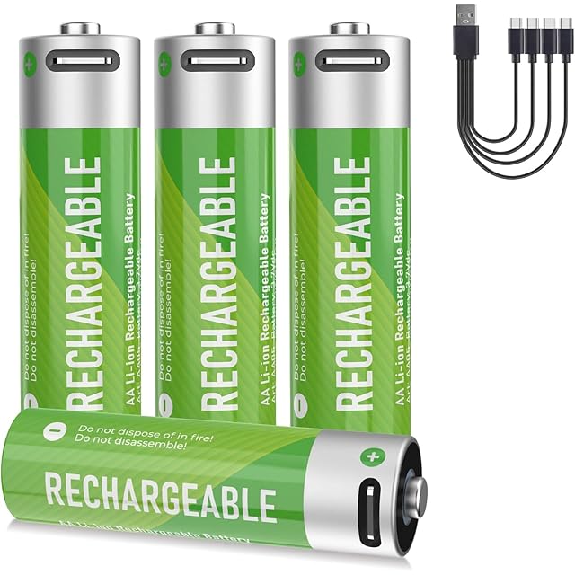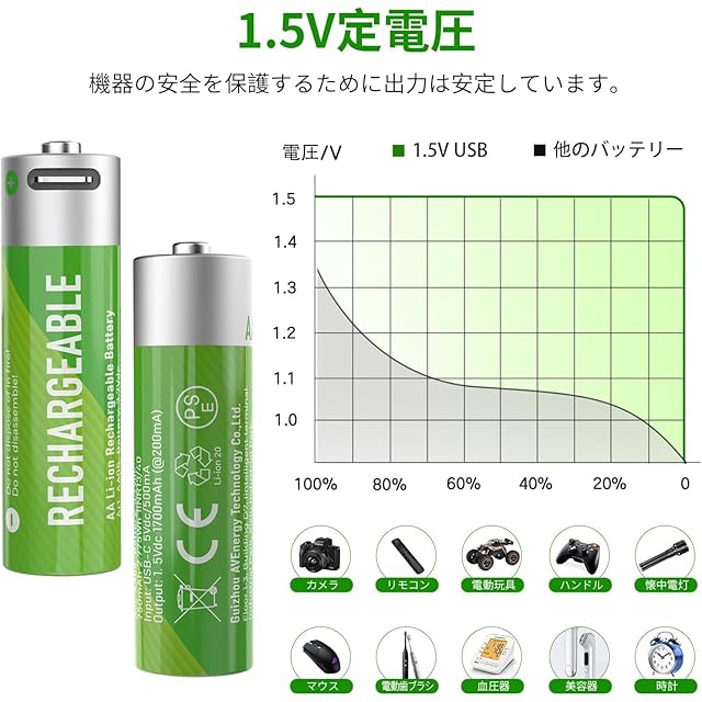 環境にやさしい単3形充電式電池、電圧1.5V 単3リチウムイオン充電池 4個セット 1500回使用可能 急速充電。