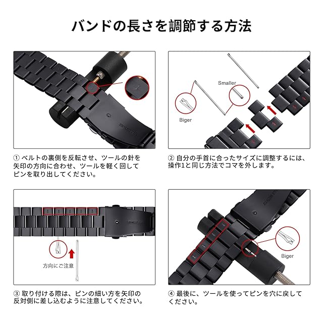【パッケージ内容】取付日本語説明書、ステンレスバンド一つ、TPU保護カバー1つ、分解キット一個、及びよりピン数本。※ 液晶の保護フィルムはは含まれていません。