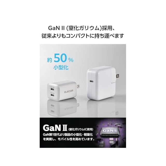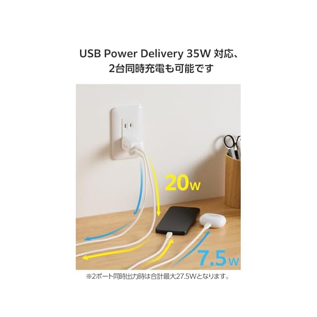 USB Type-C(TM)ポートを2ポート搭載し、Macbook Airなど対応するノートパソコン・スマートフォン・タブレットを充電できるAC充電器です。