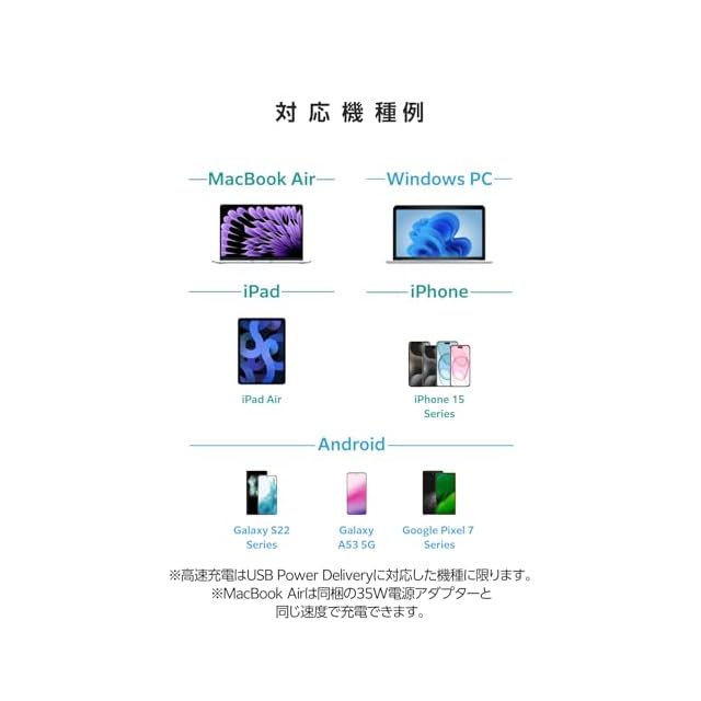 USB Power Delivery 35Wで充電可能。Macbook Airに同梱の35W 電源アダプターと同じ速度で充電できます。