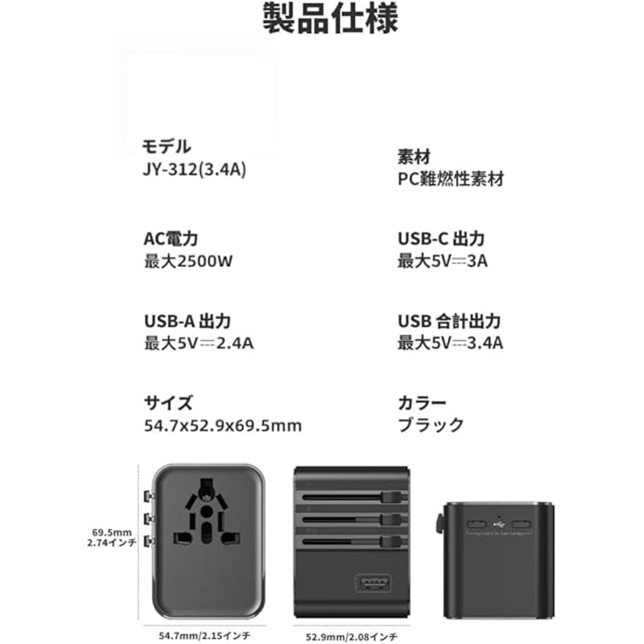 【USBポート付き】この海外アダプター変換プラグは2つのタイプaポートと1つのタイプcポートを持っています。usb-aポートは5.0V 2.4A出力、usb-cポートは5.0V 3A出力、3つのusbポートは合計5.0V 8.4A出力に対応しています。