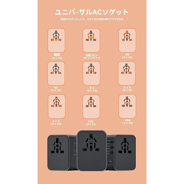 変換プラグ 海外2025最新変圧器 全世界対応 海外旅行用電源コンセ ントマルチ2つUSB-Cと1つUSB-Aポート付き C/O/BF/Aタイプ付きアダプター ヨーロッパ/韓国/オーストラリア/イギリス/アメリカ/中国などの国に対応。 日本国内の電気規格(PSE)を取得しておりません。日本国内でのご使用はできません。