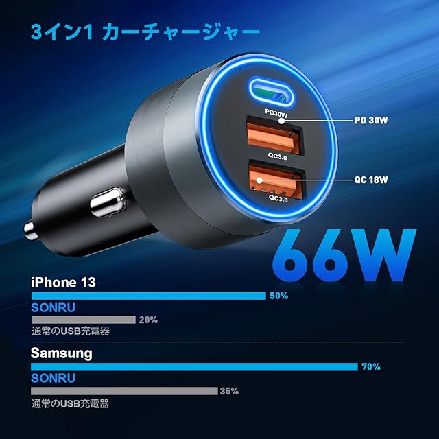 商品名:【2025進化モデル】SONRU【66W 3ポート】カーチャージャー,シガーソケット usb 車用急速充電器 PD 30W &デュアルQC3.0 超小型 リングライト付き iPhone 16/15/14/13X/XR Galaxy S22 S21 20 10 9 タブレットなどに対応