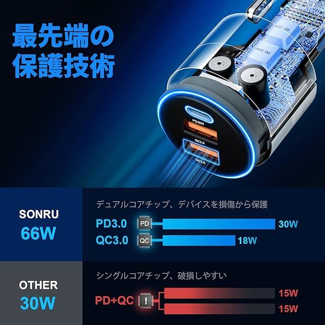 【2025最新強化版 66W】SONRU 66W高速USB Cカーチャージャーは、PD 30W(最大)とQC 18W(最大)の高出力を提供し、PD3.0/QC3.0/AFCとFCP超高速充電プロトコルをサポートします。 3台同時に充電できます。 従来の 2.4A カーチャージャーよりもはるかに高速です。