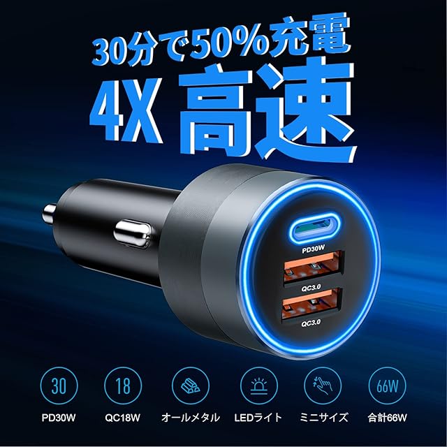 【2025進化モデル】SONRU【66W 3ポート】カーチャージャー,シガーソケット usb 車用急速充電器 PD 30W &デュアルQC3.0 超小型 リングライト付き iPhone 16/15/14/13X/XR Galaxy S22 S21 20 10 9 タブレットなどに対応 | TREND DESIGN 家電専門店