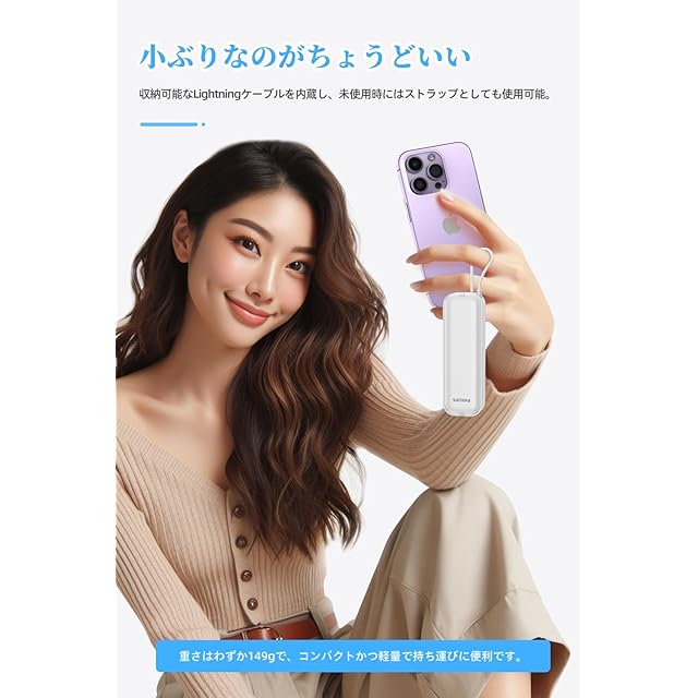 【1台3役&低電流デバイス対応】小型モバイルバッテリー、充電器とLightningケーブル内蔵する1台3役のコンセント一体型モバイルバッテリーです。外出時にはもうごちゃごちゃしない、スッキリと持ち歩くことができます。また、ワイヤレスイヤホンなどの低電流デバイスへの充電も対応されます。電源ボタンをダブルクリックすると、電源ランプが点滅し、低電流モードに切り替わります。クリックすると低電流モードをオフにします。