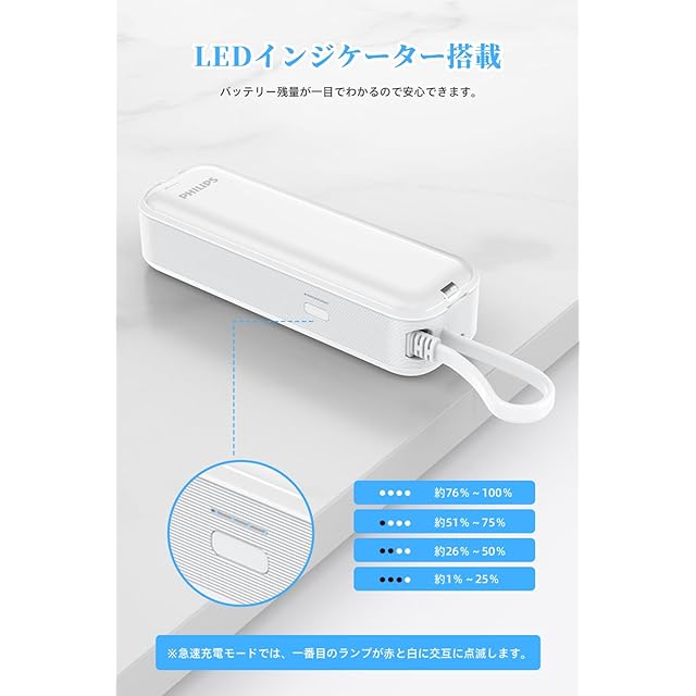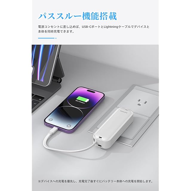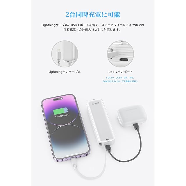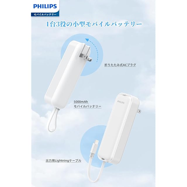 商品名:Philips (フィリップス) 小型 モバイルバッテリー コンセント一体型 5000mAh 大容量 Lightningケーブル内蔵 軽量 二台同時充電 ACプラグ付 低電流充電対応 モバイル充電器 パススルー機能 PSE認証済 ホワイト DLP5201VW