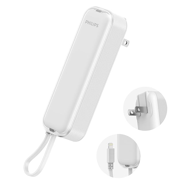 Philips (フィリップス) 小型 モバイルバッテリー コンセント一体型 5000mAh 大容量 Lightningケーブル内蔵 軽量 二台同時充電 ACプラグ付 低電流充電対応 モバイル充電器 パススルー機能 PSE認証済 ホワイト DLP5201VW