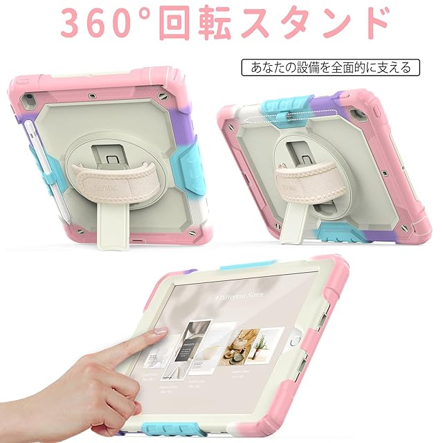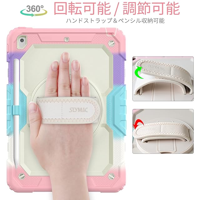 SEYMAC stock iPad 10.2インチ 第9世代/第8世代/第7世代 ケース 耐衝撃 保護フィルム付き ペン収納 360°回転スタンド ハンドストラップ ショルダーストラップ 全面保護カバー (色とりどり+ピンク)