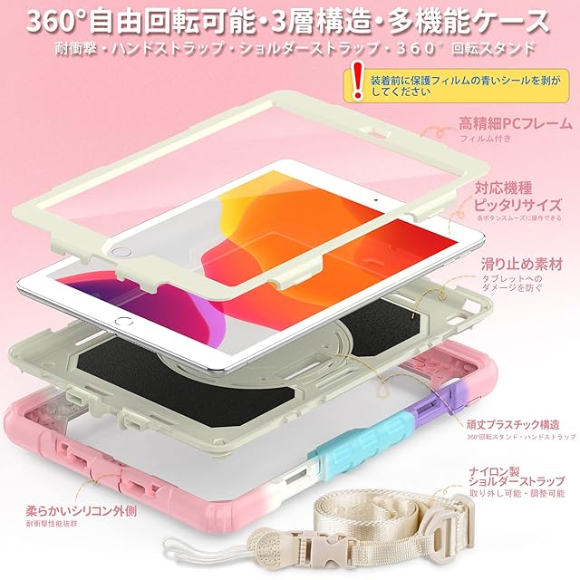 ★【ハンドストラップ&ショルダーストラップ】:どの場所、状況でも使いやすい、手を通すタイプのハンドストラップ&首や肩に掛けるタイプのショルダーストラップは遊び、旅行中などにハンズフリーになります。大事なiPad第9世代/第8世代/第7世代を落とさずに操作に集中できます。子供にも気楽に楽しめます。