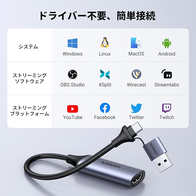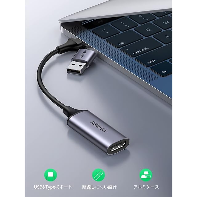 商品名:UGREEN HDMI キャプチャーボード Switch対応 4K@60Hz Type C&USB 1080P@30Hz キャプチャ ゲーム録画/ビデオ録画/ライブ配信 iPad OS17/Mac/Windows/Linux/Android/PS5に適用