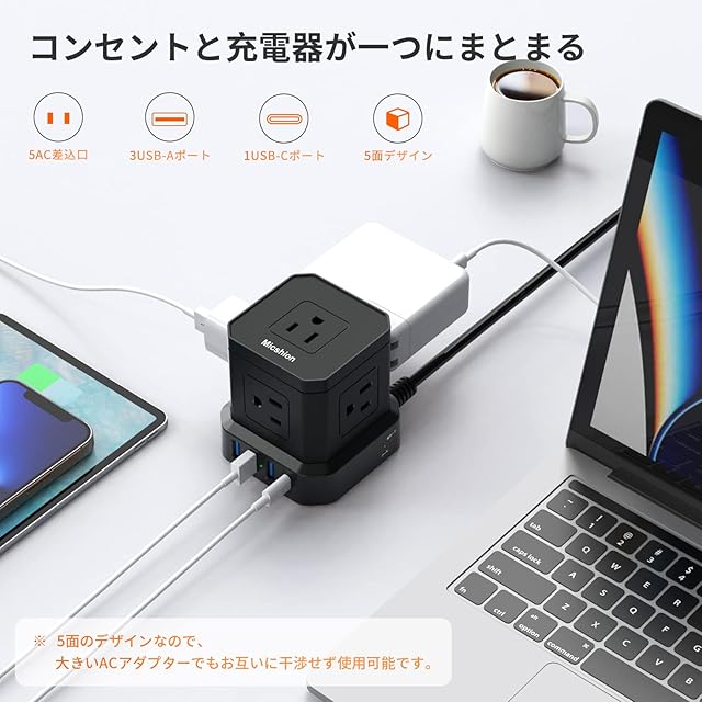 商品名:Micshion キューブ型電源タップ Type-C付 延長コード 2m 雷ガード 5個AC口(2400W) 3個USBポート 1個Type-C コンセントusb付き 電源タップ usb付き タコ足配線 テーブルタップ たこあしコンセント マルチタップ 安全保護機能 自宅用 会社用 ブラック