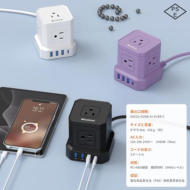 <p>製品仕様</p><p></p><p>・サイズ:80*80*83mm</p><p></p><p>・材質:ABS + PC耐火材</p><p></p><p>・入力電圧:100-240V/50-60Hz</p><p></p><p>・定格出力:12A/2400W(最大)</p><p></p><p>・USB-A出力:5V 3.1A(Total) USB-A出力:5V 2.4A Max(Each) </p><p></p><p>・USB-C出力:5V 3A Max</p><p></p><p>・接続口:5つの2ピンAC充電口、3つのUSB-Aポート、1つのUSB-Cポート</p><p></p><p>・電源コード長さ:2M</p><p></p><p>・安全保護:過負荷保護と落雷保護</p><p></p><p></p><p>このキューブ型電源タップのメリット:</p><p></p><p>お互いに干渉しない:このタコ足コンセントは、立体集成構造を採用し、コンパクトで省スペースです。キューブ型形状により、電源タップに接続した際も隣のコンセントへの干渉を抑えます。</p><p></p><p>安定感が抜群:卓上で安定感をもたせるため電源コードを底面近くに配置した低重心設計を採用しており、重いアダプターをかけても倒れにくいです。</p><p></p><p>スマート充電:複数機器を接続した場合、最大2400Wの消費電力に対応し、自動判別機能を通して、接続されたデバイスに最適な電流を出力します。</p><p></p><p>安全保護機能:最大2400Wを超えると電流を遮断する「サーキットプロテクタ」を採用し、雷カード、過負荷・過充電・過熱・過電圧・ショート保護を搭載、PSE(電気用品安全法)認証取得済みの商品で、安全性には万全を期しています。</p><p></p><p>コンパク:幅8×奥行き8×高さ8.3cmとコンパクトで、省スペースで使えるので、デスクの上やテレビ周りなど、さまざまな場所で重宝します。</p><p></p><p></p><p>ご使用上の注意:</p><p></p><p>1.許容消費電力は2400Wなので、使用される電気機器の総合消費電力に越えないように十分ご注意ください 。</p><p></p><p>2.濡れた手や濡れた物で作業ソケットやプラグに触れないでください。</p><p></p><p>3.部屋中に使用してください。</p><p></p><p>4.子供の手の届かないところに置いてください。</p>