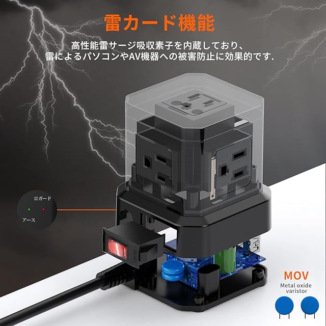 【落雷保護と過負荷保護】このoaタップは絶縁キャップが装備されており、トラッキング火災の防止に有効です。耐火性ABS+PC材料により、最高750℃までの耐火性があります。アース付きで電磁波対策が取れること以外、このコンセントusb付きは高性能雷サージ吸収素子を内蔵しており、雷によるパソコンやAV機器への被害防止に効果的です。さらに、最大2400Wを超えると電流を遮断する「サーキットプロテクタ」を採用し、過負荷・過充電・過熱・過電圧・ショート保護を搭載、PSE(電気用品安全法)認証取得済みの商品で、安全性には万全を期しています。