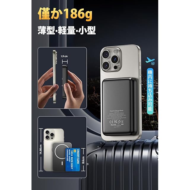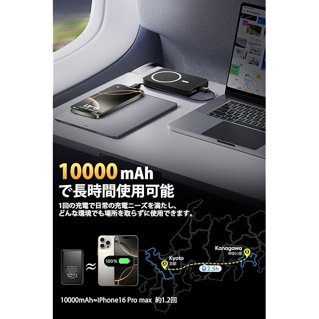 【10000mA大容量·飛行機内に持ち込み可能】モバイルバッテリー magsafe 最新的な大容量モバイルバッテリーですが、iPhone 15 Pro/14を約1.8回左右、iPhone 13mini/12miniを約2.6回左右、Galaxy S20を約2回左右することができます、ipad mini6を約1.4回左右さらに、USB-CポートはPD出力・入力両対応し、PD対応USB-C充電器を使えば、わずか2-4時間で充電器本体をフル充電できます。