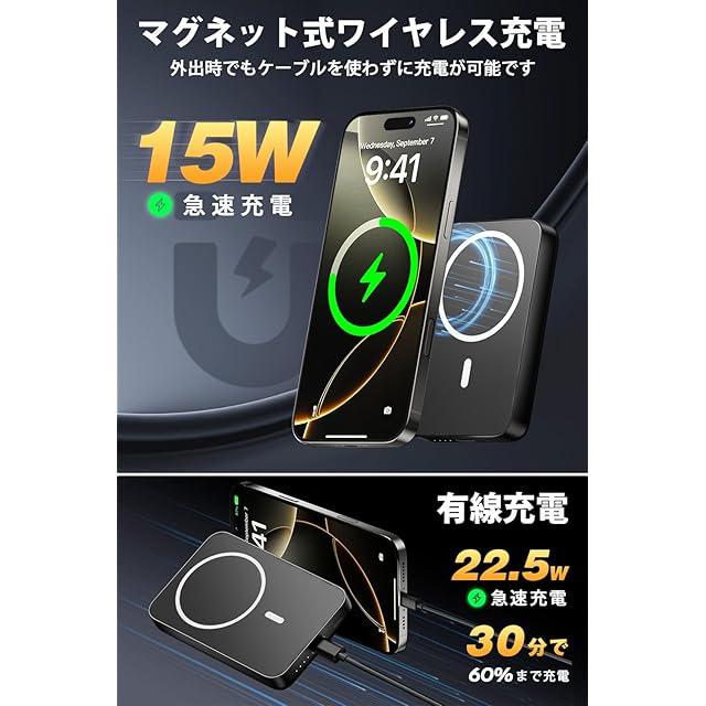 【マグネット式・くっついたまま充電可能】MagSafe技術を応用した磁気吸着式ワイヤレスモバイルバッテリー。内蔵の強力マグネットでスマートフォンにピタッと貼り付き、すぐに充電開始。10000mAhの大容量で日常使いや出張にも十分対応。ケーブル不要で持ち運びも快適です。重量はわずか186gと軽量・コンパクト。アウトドアや災害時にも頼れる心強い予備電源です。