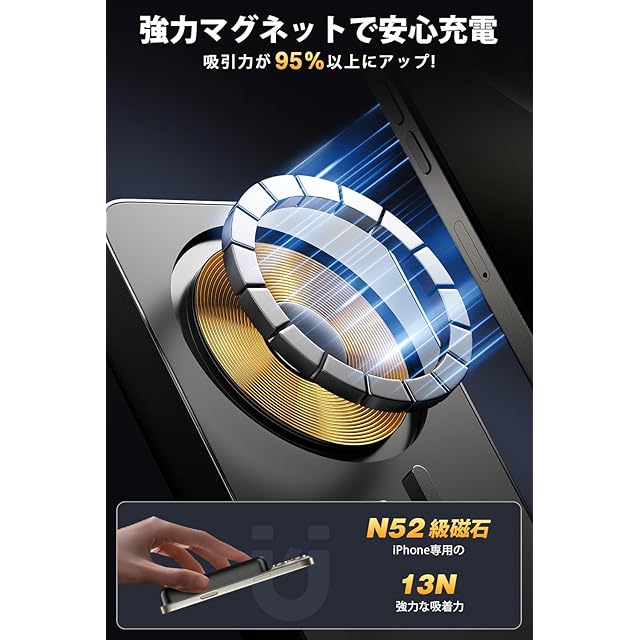 【ワイヤレス急速充電&マグネット式】MagSafe磁気吸着技術を採用し、強力な磁石でiPhone 16/15/14/13/12シリーズにピタッと吸着。最大15Wのワイヤレス急速充電が可能です。Qi対応スマートフォンも対応しますが、MagSafe対応ケースの使用を推奨。充電効率向上のため、ケースを外しての使用がおすすめです。