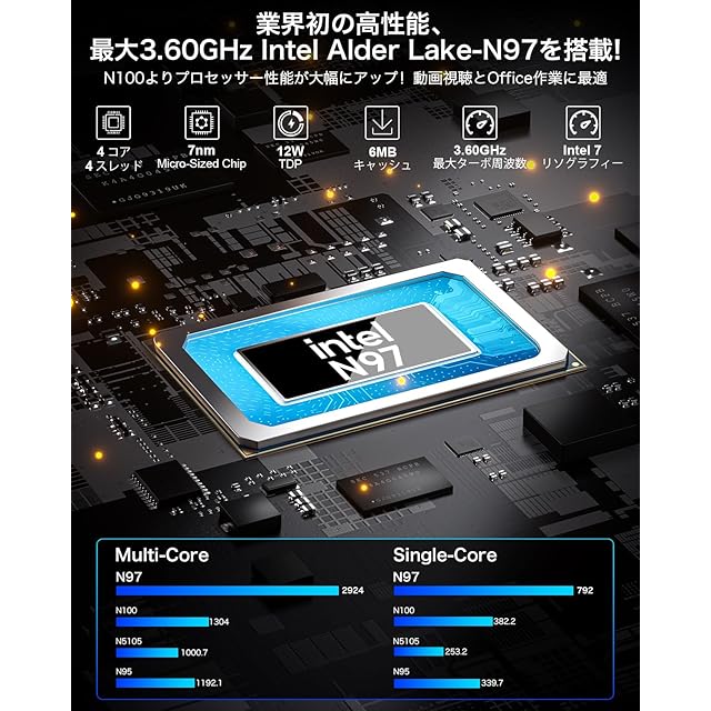 【第12世代N97・Windows11 ProミニPC登場】GMKtec-G5は最新の第12世代のインテルAlder Lake-N世代のN97プロセッサーを搭載しています。(最大周波数3.6GHz、4C/4T、6MBキャッシュ )プロセッサーを内蔵しており、メモリ/ストレージは12GB+1TBを標準搭載、高性能及び小型体積兼備の新型ミニパソコンが登場。
